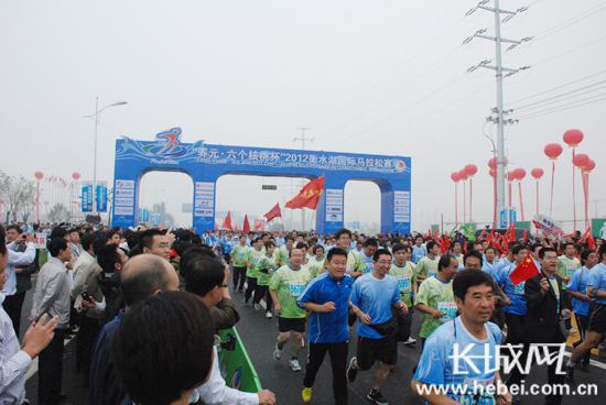 發(fā)令槍響起,2012衡水湖國(guó)際馬拉松賽開跑。扈煒 攝