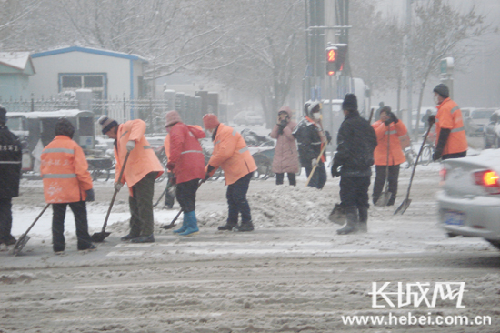 天空飄著雪花,環(huán)衛(wèi)工人一大早就開始清理路面的積雪。扈煒 攝