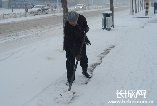 一位老人在清理便道上積雪,令人敬佩。扈煒 攝