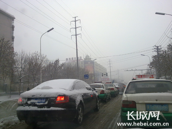 降雪天氣給市民出行帶來不便,路上車輛緩慢前行。扈煒 攝